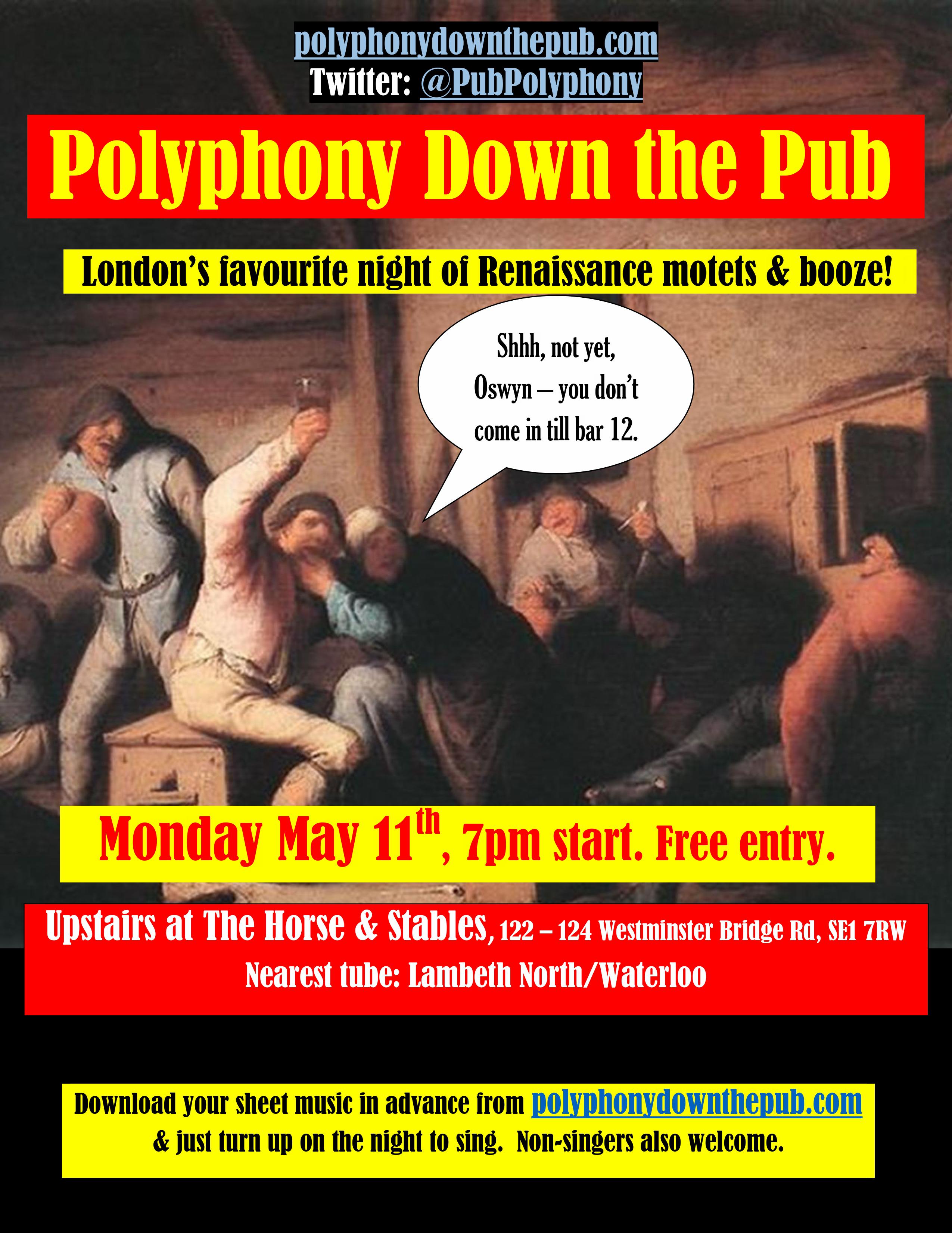 Our second session of the year was PDtP 6: Because You Can’t Keep a Good Singing & Drinking Event Down (catchy, eh?). We pulled off the tricky task of getting a bunch of half-cut blokes to sing the plainchant of Taverner’s Dum transisset Sabbatum I in perfect unison, and we dived into the 7 part lusciousness of Vinders’ O Mors inevitablis. All of the above high-fallutin’ness was nicely counterbalanced by the absurd (and very un-PC) Contrapunto bestiale a la mente by Banchieri.
